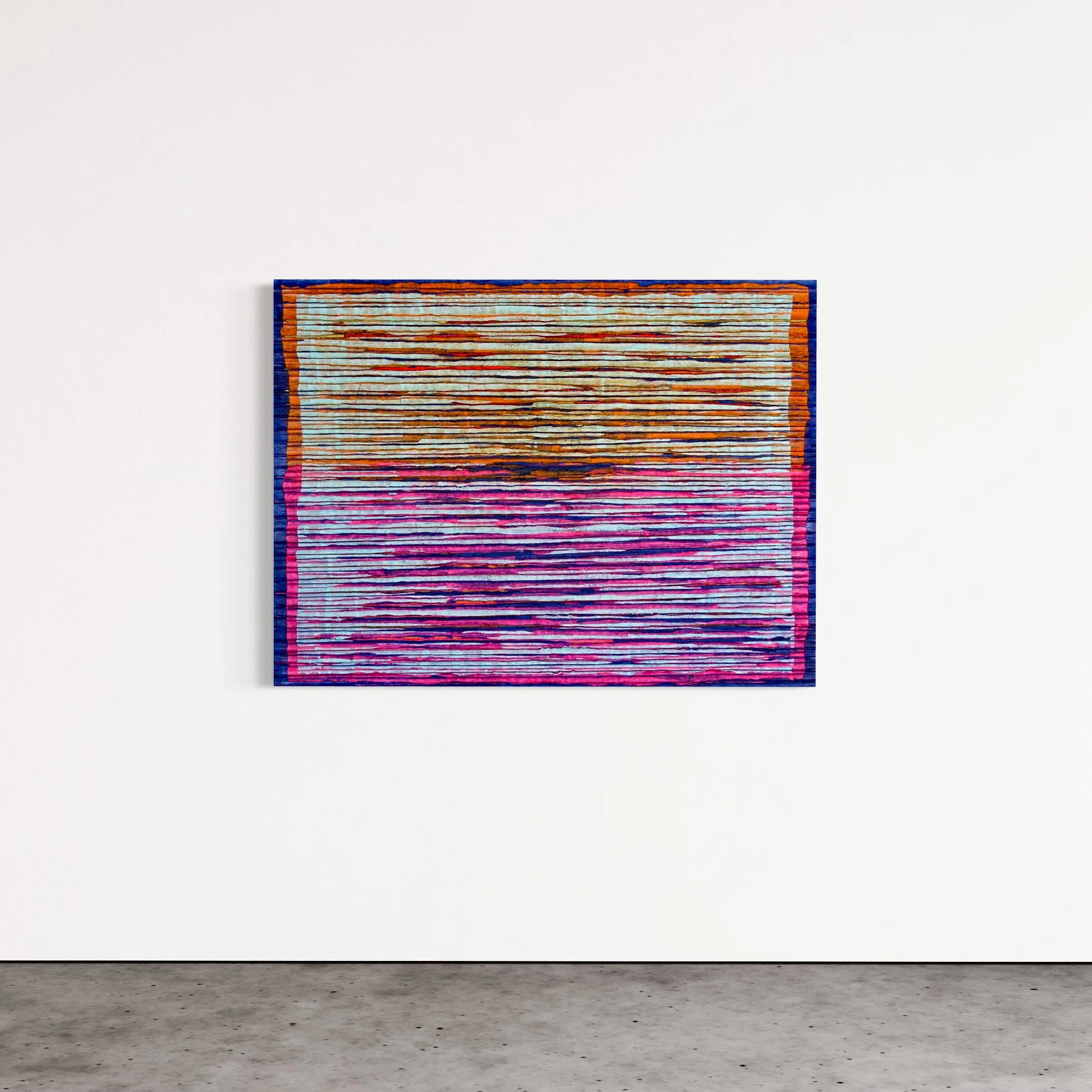 In Radiant Fissures, quiet equilibrium gives way to emergence. Layers of paper—first built, pressed, and fixed into place—are later stripped, cut, and abraded along measured paths, revealing what was not necessarily meant to be seen. Each incision exposes a hidden interval of color, as if radiance itself were uncovered through loss and fracture. What was painstakingly constructed is partially undone, its destruction becoming a kind of revelation. The compositions balance precision and surrender: linear frameworks contain the aftermath of erasure, while remnants of pigment linger like memory beneath the surface. The result is both architectural and ephemeral—a quiet force unfolding through seam and fracture, where beauty arrives not through perfection, but through what is allowed to be undone.