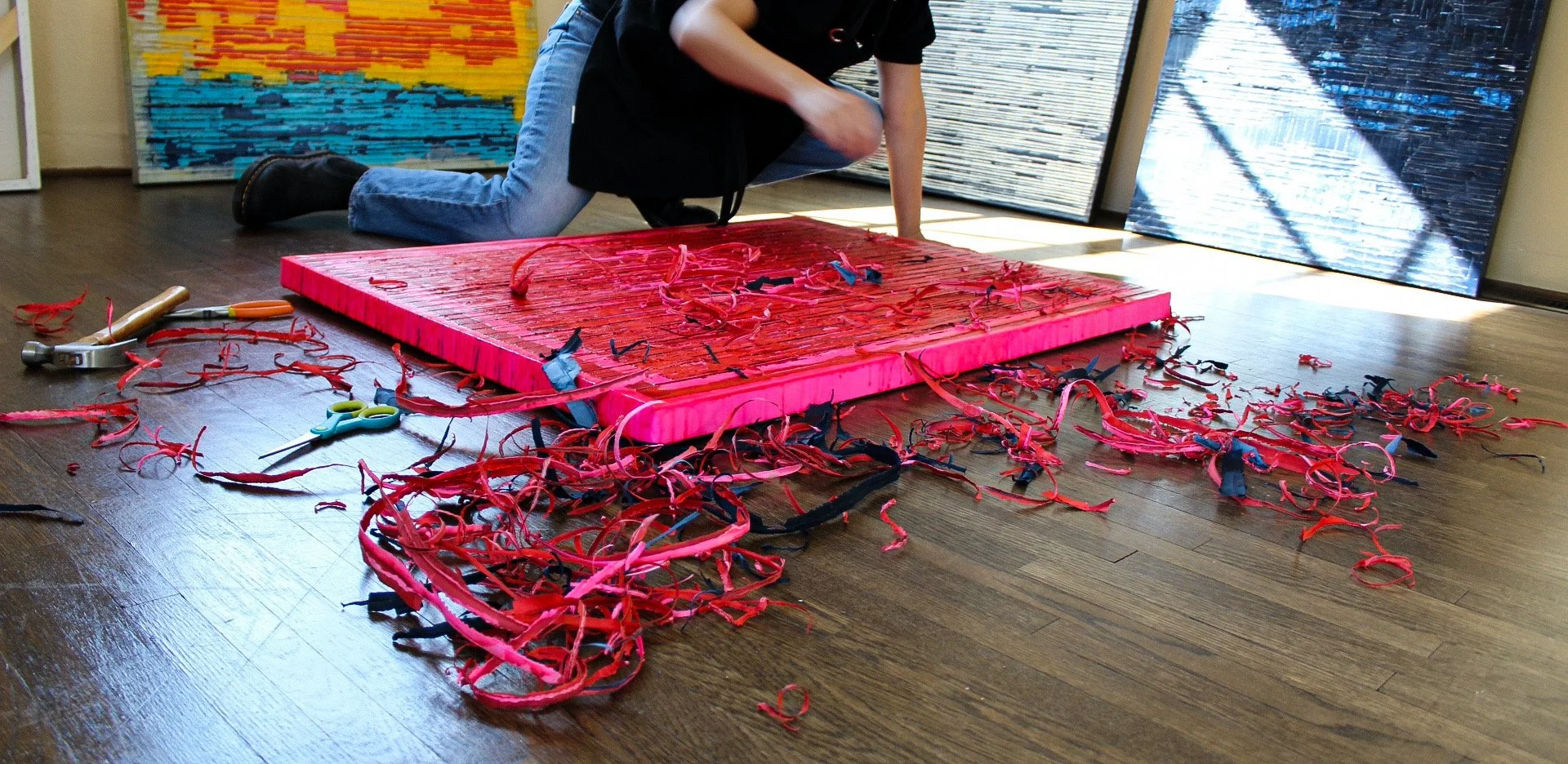 In Radiant Fissures, quiet equilibrium gives way to emergence. Layers of paper—first built, pressed, and fixed into place—are later stripped, cut, and abraded along measured paths, revealing what was not necessarily meant to be seen. Each incision exposes a hidden interval of color, as if radiance itself were uncovered through loss and fracture. What was painstakingly constructed is partially undone, its destruction becoming a kind of revelation. The compositions balance precision and surrender: linear frameworks contain the aftermath of erasure, while remnants of pigment linger like memory beneath the surface. The result is both architectural and ephemeral—a quiet force unfolding through seam and fracture, where beauty arrives not through perfection, but through what is allowed to be undone.